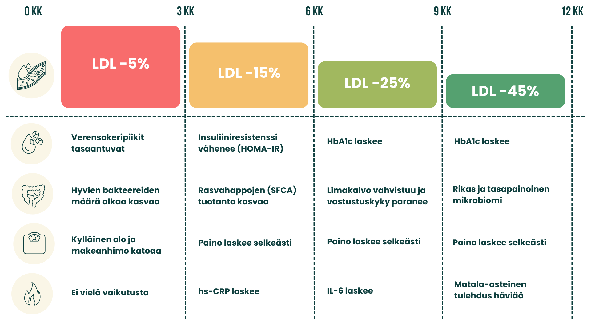 Tulokset voivat vaihdella, mutta yleensä selkeä vaikutus kolesterolitasoihin voidaan havaita kolmen kuukauden säännöllisen käytön jälkeen. Glucavena laskee kolesterolia keskimäärin 10 % kuukaudessa.